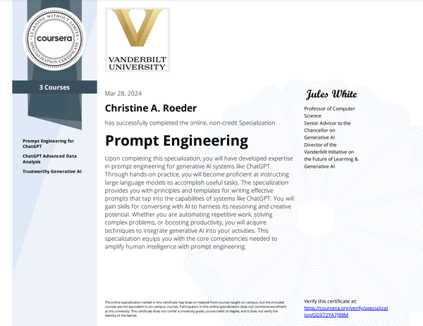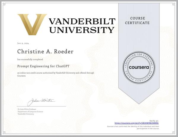 January 9 2024 Prompt Engineering for ChatGPT Vanderbilt University on Coursera. Click to verify my Certificate and see more about my accomplishment.
