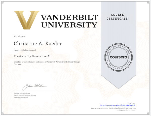 March 28 2024 Trustworthy Generative AI Vanderbilt University on Coursera. Click to verify my Certificate and see more about my accomplishment.
