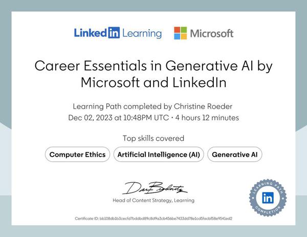 December 2 2023 Career Essentials in Generative AI LinkedIn Learning issues digital credentials. Click to verify my Certificate and see more about my accomplishment.
