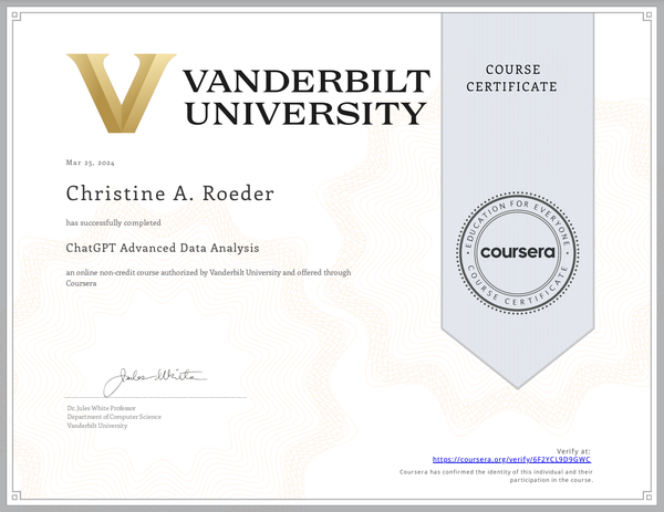March 25 2024 ChatGPT Advanced Data Analysis Vanderbilt University on Coursera. Click to verify my Certificate and see more about my accomplishment.